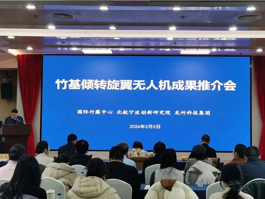 2月5日,由国际竹藤中心牵头,联合北京航空航天大学宁波创新研究院、龙竹科技集团股份有限公司共同研发的竹基倾转旋翼无人机成果推介会在京召开。